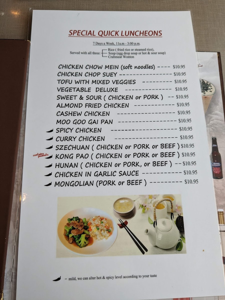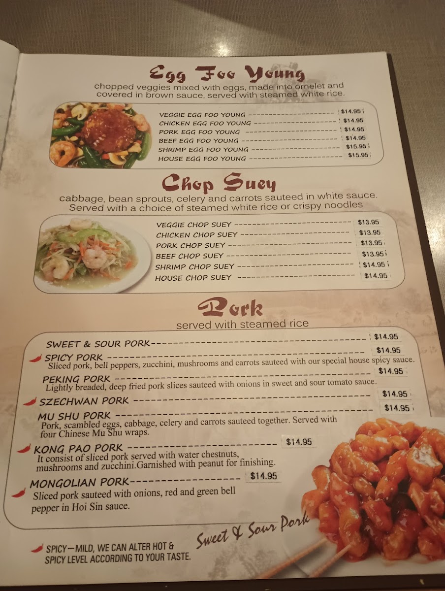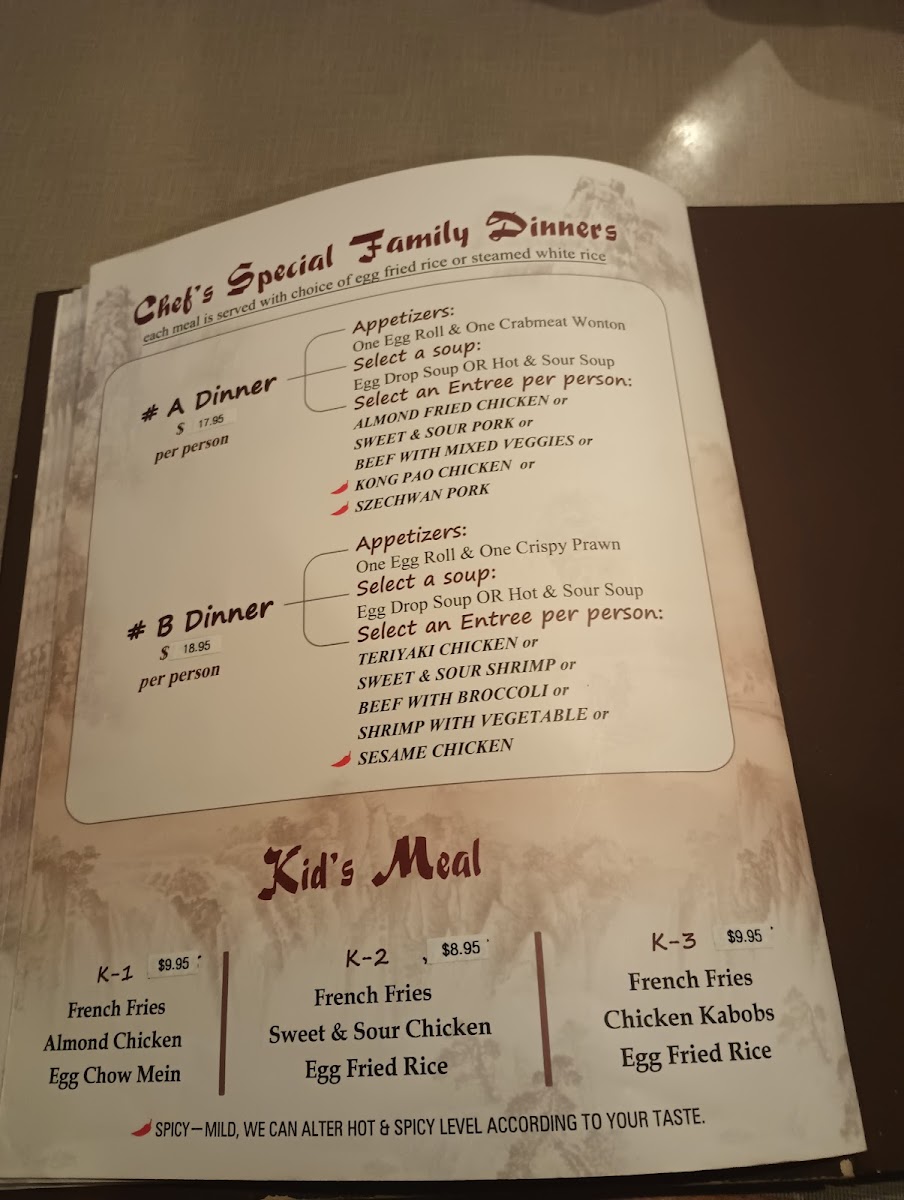 - Main Entrees: The menu offers a selection of meat, seafood, and vegetarian dishes such as Sweet & Sour Chicken, Orange Chicken, Honey Walnut Shrimp, Sesame Chicken, Teriyaki Chicken, Beef Chow Ho Fun, and various styles of Chow Mein and Chop Suey. Some dishes allow customization of spice levels.
