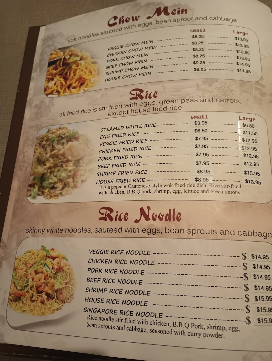 - Rice and Noodles: A variety of fried rice options, including Pork Fried Rice and House Fried Rice, as well as noodle dishes like Chicken Chow Mein and Veggie Chow Mein Noodles, are available to complement main dishes.